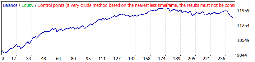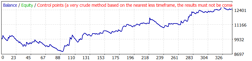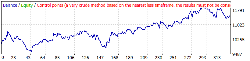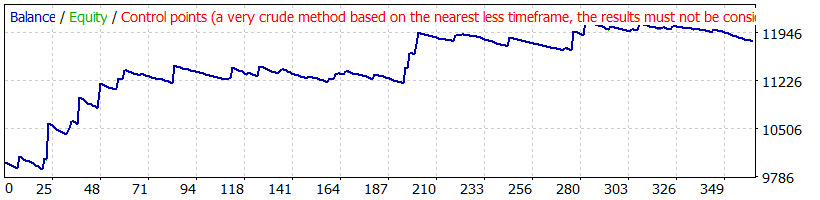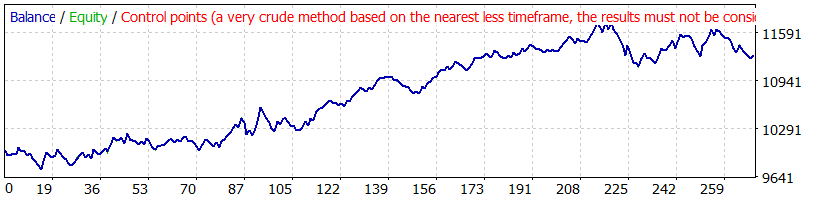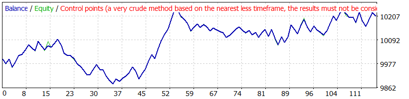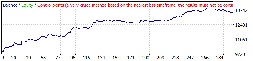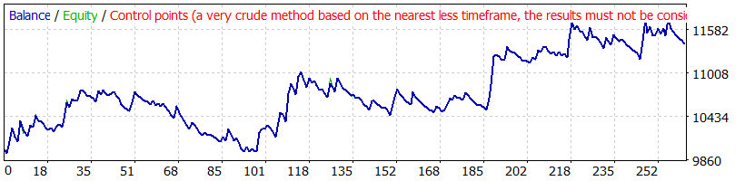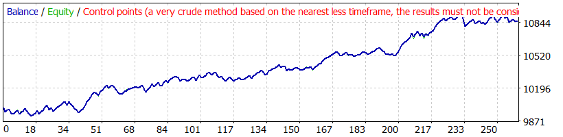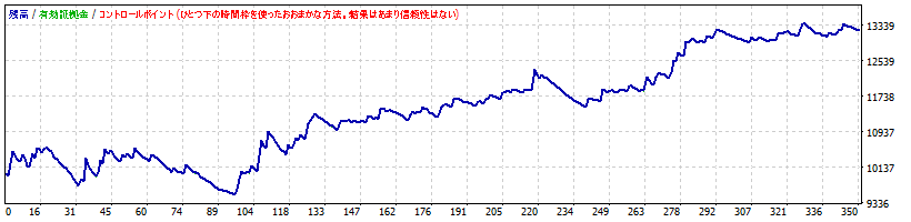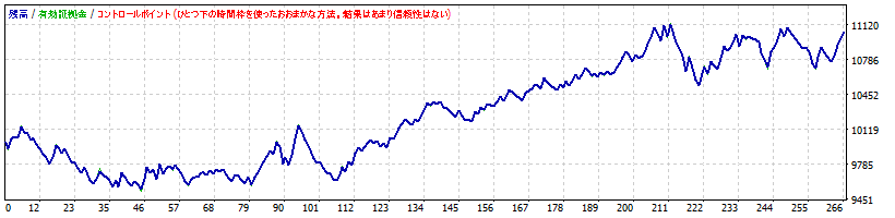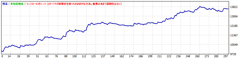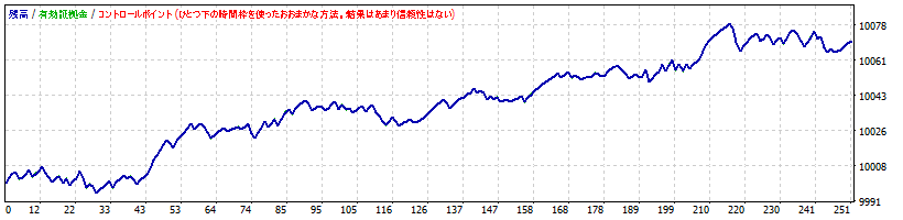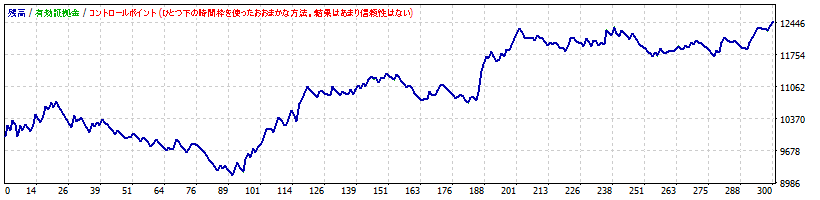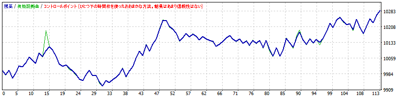 | ちなみに、「バックテストはEvery tickでやらないとダメ」と記載するwebサイトがありますが、必ずしもそうではありません。例えば、Every tickとControl pointsで同じ結果が得られるEAは、多少の相場の違いでは結果が左右されないくらいマージンを確保しているシステムとも考えることができます。下図には、Every tickとControl pointsで同じ成績が出るEAの例をお示しします。W2C-Fibozowは、Every tickとControl pointsで同じ結果が得られるように設計しています。 |