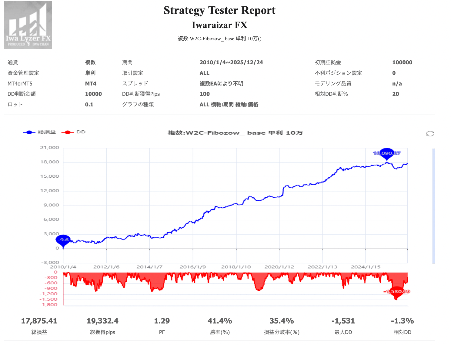 W2C-Fibozow_baseは、6通貨ペア10種類のW2C-Fibozowにより構成されています。以下岩ライザーを用いた各EAの結合分析結果をそれぞれEAのバックテスト結果を列記します。
